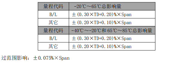 调量程的参考精度 (包括从零点开始的线性、回差和重复性):± 0.075% 若 TD>10 (TD=最大量程/调节量程),则为:±(0.0075×TD)%